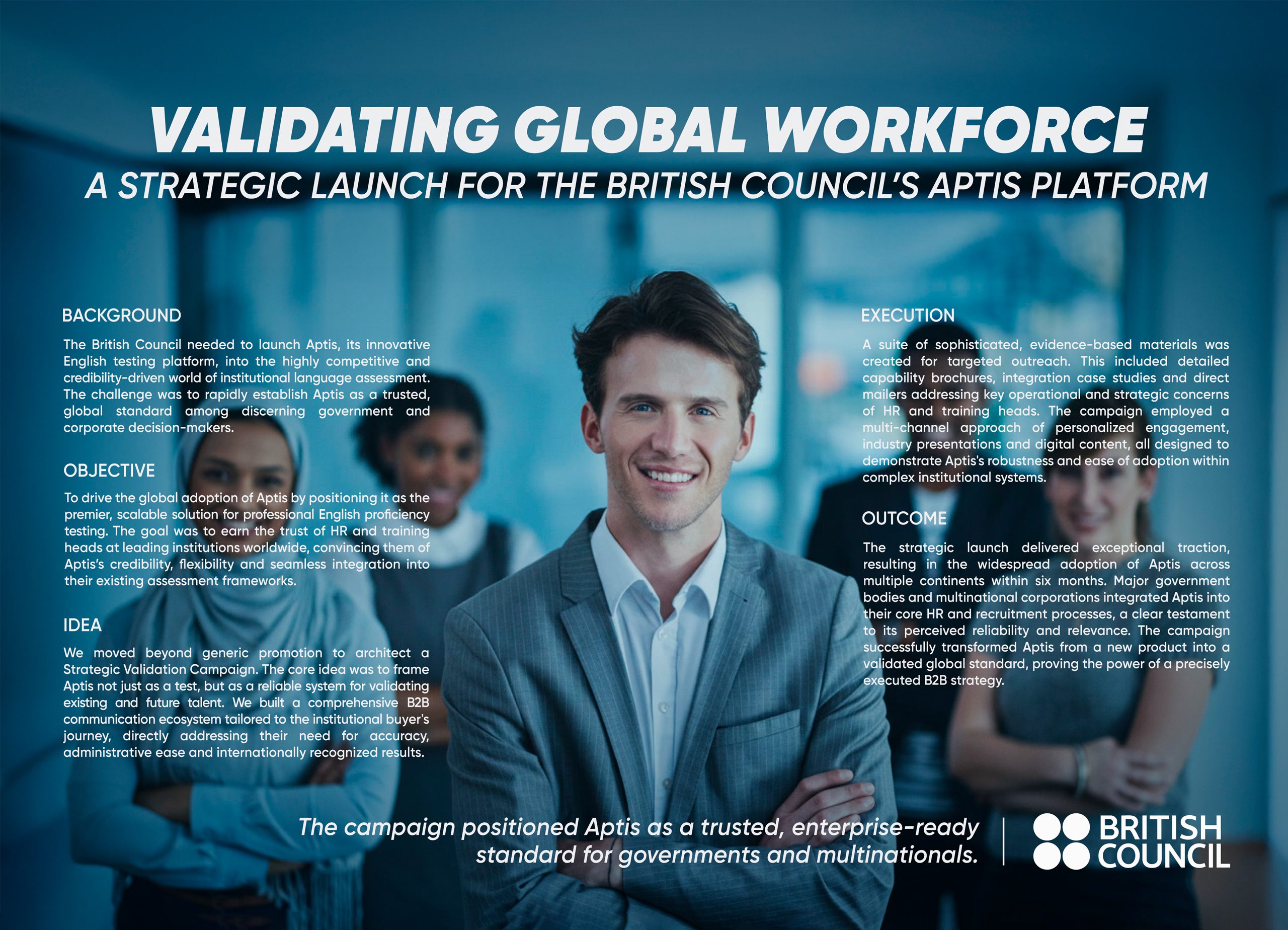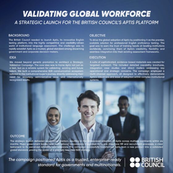 Support the launch of Aptis, the British Council’s English testing platform, by driving adoption among government and corporate institutions worldwide. The goal was to position Aptis as a credible, scalable solution for evaluating English proficiency in formal, professional environments.