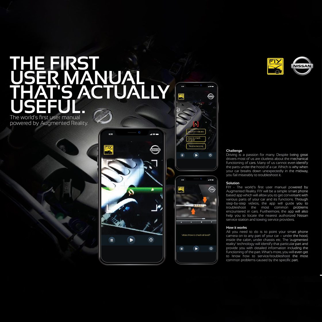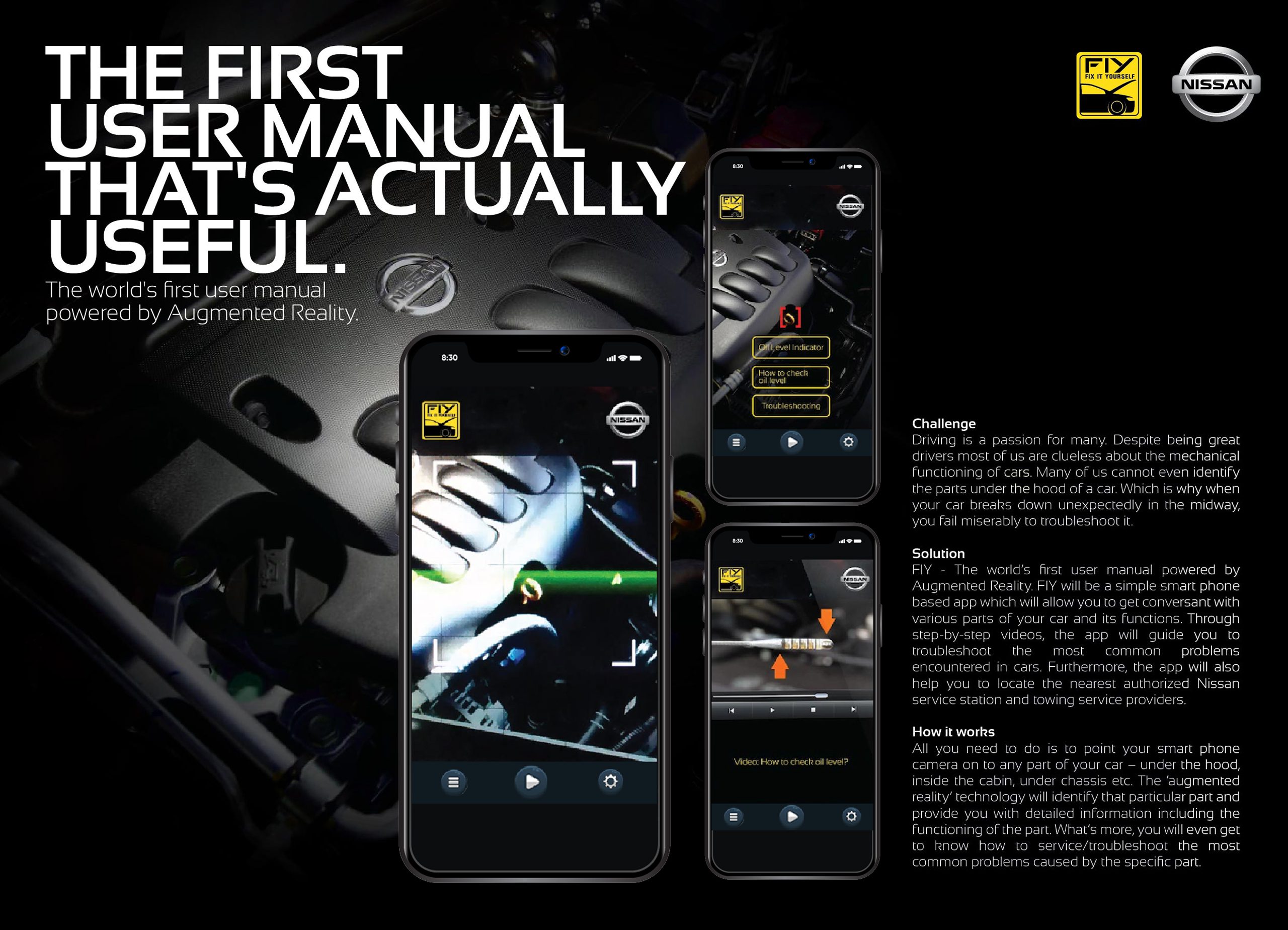 FIY, the world’s first augmented reality–powered car user manual. A smartphone app that lets users point their camera at any part of the car to instantly understand what it is, how it works and how to troubleshoot common issues. By combining AR with step-by-step video guidance and service locator support, FIY turns the car itself into an interactive manual.